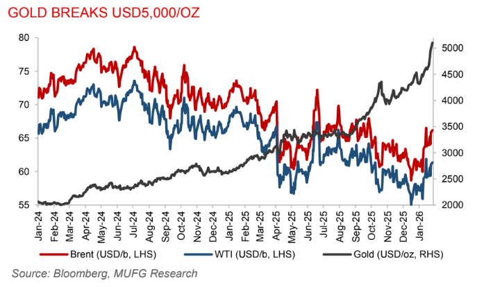 Gold breaks USD5,000 as geopolitical turmoil and currency fears supercharge haven demand. Gold surged beyond USD5,000/oz for the first time, extending a powerful rally driven by escalating geopolitical tensions, a weakening dollar, and growing investor distrust in sovereign bonds and currencies. Gold climbed more than 2% to above USD5,085/oz, while silver also jumped to fresh record highs above USD100/OZ, supported by strong global retail demand. Recent US policy action, including renewed attacks on the Fed, threats of sweeping trade tariffs, geopolitical brinkmanship, and signs of stress in major bond markets such as Japan, have reinforced gold’s role as a barometer of market fear. Expectations that the next US Fed chair could adopt a more dovish stance, alongside swelling public debt in advanced economies, have further strengthened the appeal of non-yielding precious metals as a store of value.
