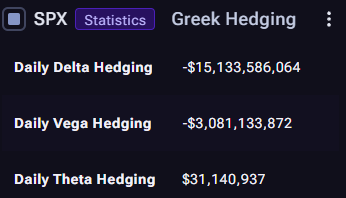 Greek Hedging (SPX) estimates the day’s dealer rebalancing flows implied by the current options book essentially how much trading may be required for dealers to stay hedged as prices and volatility move.