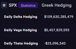 Greek Hedging (SPX) estimates the day’s dealer rebalancing flows implied by the current options book essentially how much trading may be required for dealers to remain hedged as prices and volatility move.
