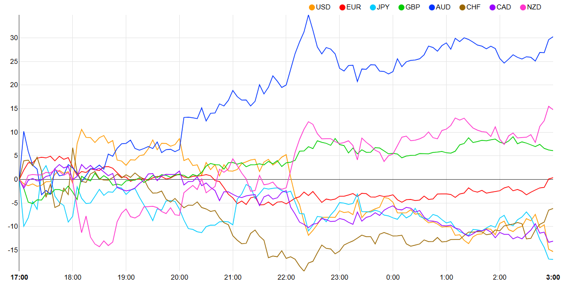 Currency Strength Chart: Strongest: AUD, NZD, GBP, EUR, CHF, CAD, USD, JPY - Weakest