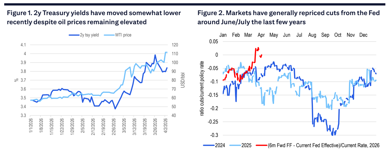 Oil prices rose as the specifics on a path towards resolution of Middle East disruptions remain unclear. But rather than a substantial move higher in yields on concerns of higher inflation, interest rate markets have shifted more towards balancing downward growth implications from higher oil prices with upside inflation risks. Fed officials will feel very comfortable keeping rates on hold for now following the strong March jobs report, with markets pricing rates essentially unchanged through the year.