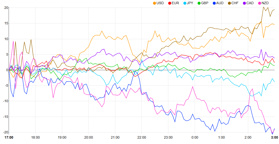 Currency Strength Chart: Strongest: CHF, USD, CAD, EUR, GBP, JPY, AUD, NZD - Weakest