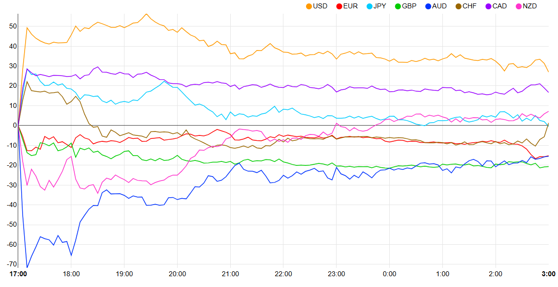 Currency Strength Chart: Strongest: USD, CAD, NZD, CHF, GBP, AUD, NZD, GBP - Weakest