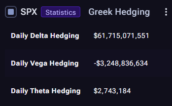 Greek Hedging (SPX) estimates the day’s dealer rebalancing flows implied by the current options book essentially how much trading may be required for dealers to remain hedged as prices and volatility move.